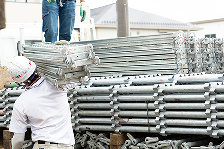 足場工事とは、建築現場など高所で作業をする際に、足元を支える足場の工事のこと。
